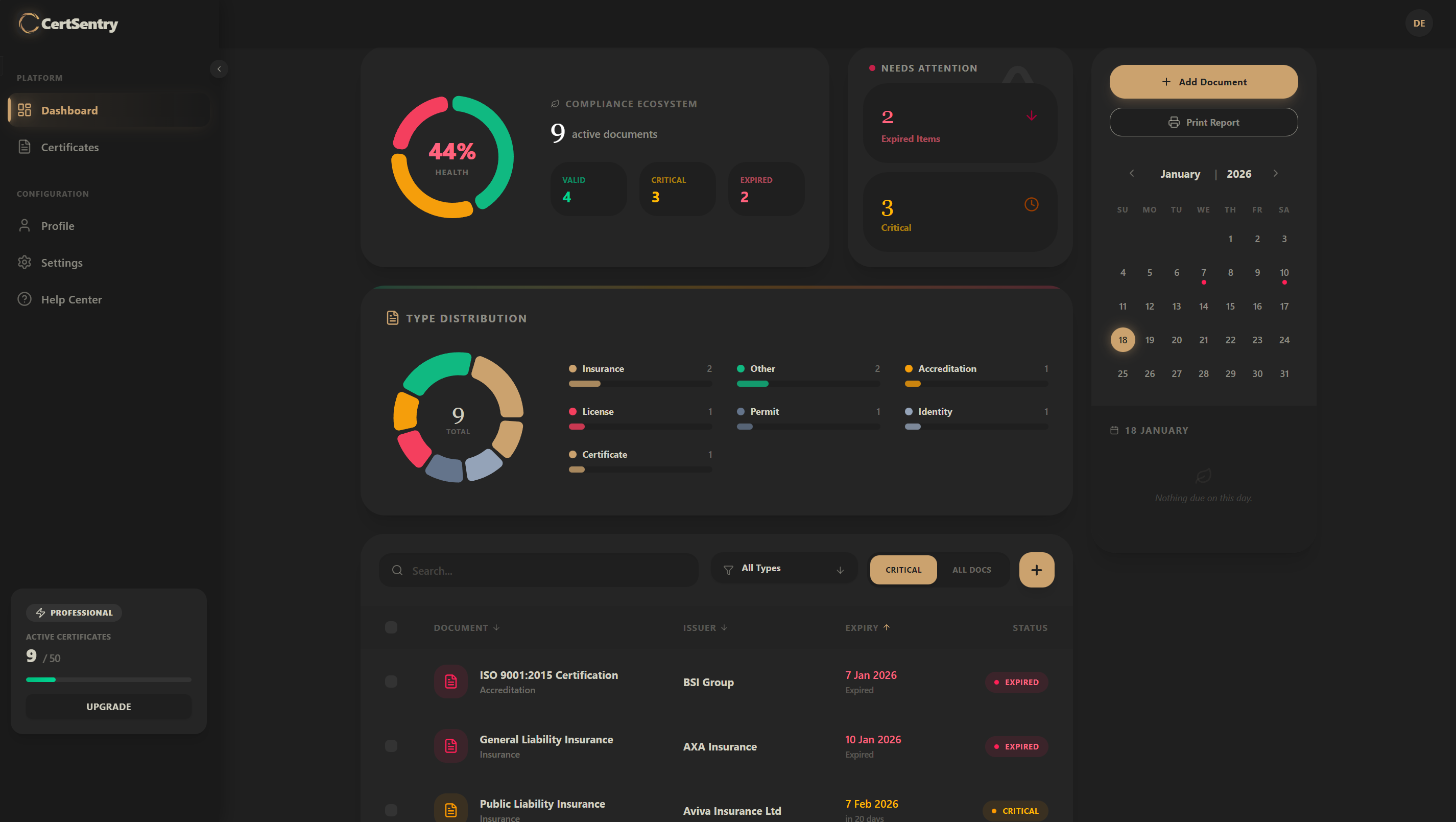 We'll email you at 60, 30, 14, 7 & 1 days before any certificate expires. You'll never be surprised by a deadline again.